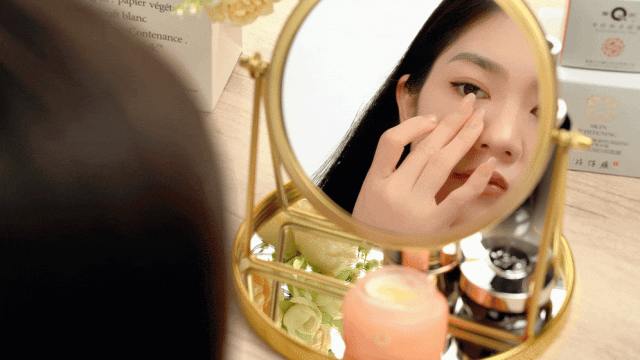 洗完脸后沾取眼霜用手指或者按摩棒轻轻按摩眼周3分钟,就能感受到微微的热感,安心又舒服~