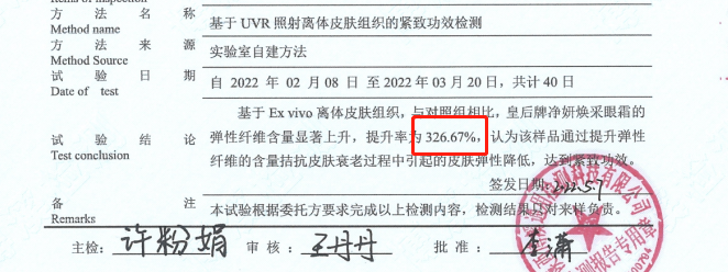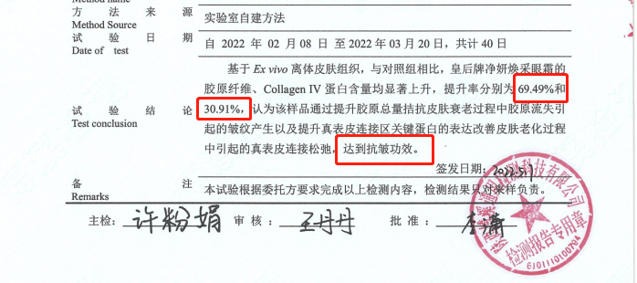 小编特意先把产品寄到权威的机构测试,先用比较直观的数据来看数据来看下(抗皱加紧致的效果)。