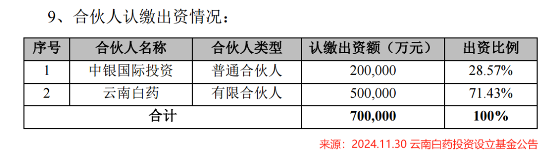 2024年11月30日,云南白药发布公告称,要和中银国际投资一起设立云南省中医药大健康创新基金,规模70亿。