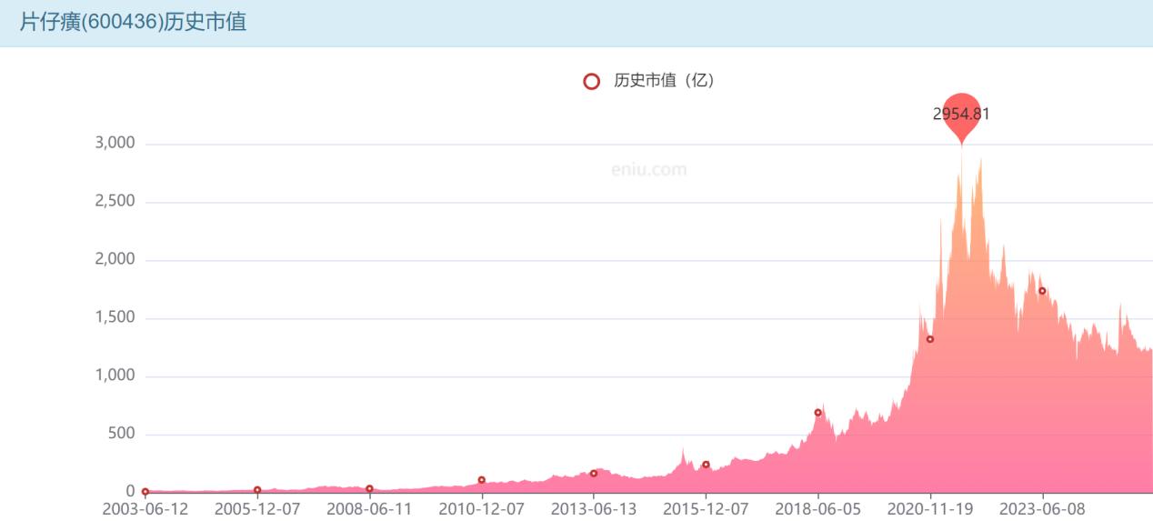 片仔癀在资本市场上凭借双绝密配方与稀缺原料构建的壁垒,曾被赋予“药中茅台”的溢价,巅峰时期市值更是一度接近3000亿元,然而如今只有此前的三分之一(截至2025年4月1日,收盘时市值为1204亿元)。同样在市值高点的2021年,片仔癀的零售价也一度被炒到1600元/粒,单克价格比黄金都贵。