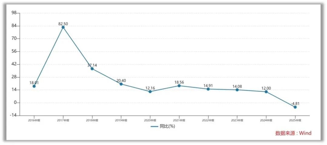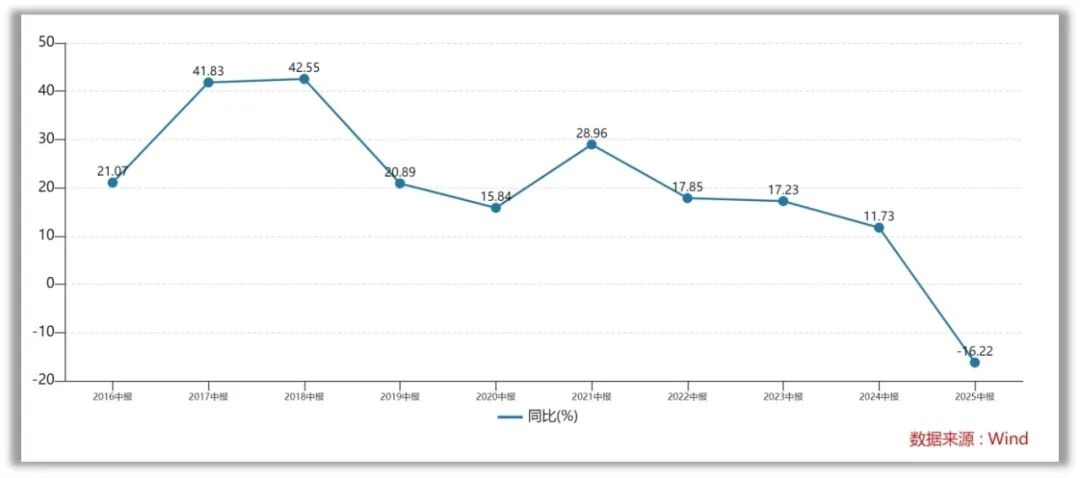 如果从归母净利润来看的话,下滑迹象就更加明显了,2025年上半年的增速断崖式下降到-16.22%。