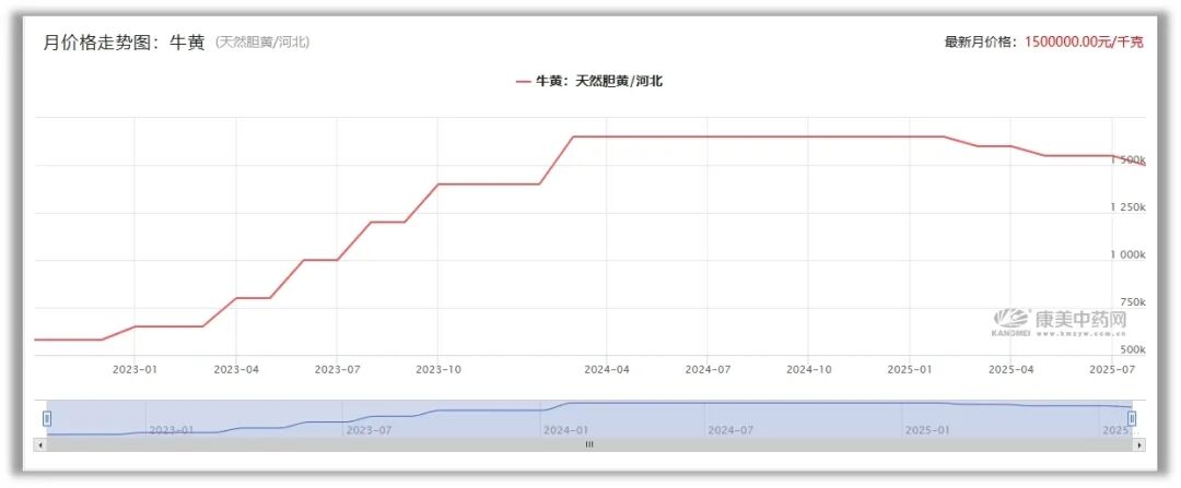 康美中药网的数据显示,2023年初每公斤天然牛黄的价格仅有65万元,而目前已经上涨到150万元,涨幅超过100%。