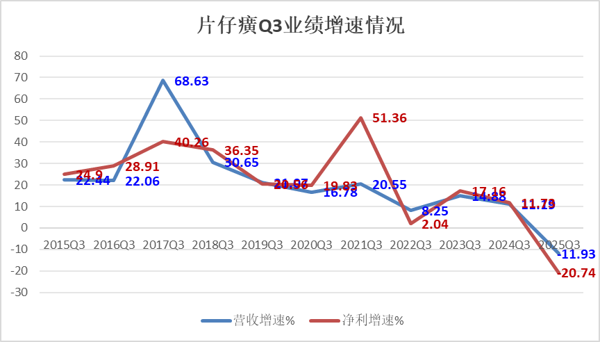 曾被誉为“药中茅台”的片仔癀,在2025年的秋天迎来了近二十年来的首个“双降”寒冬。前三季度,公司营收74.42亿元,同比下降11.93%;归母净利润21.29亿元,同比下降20.74%。