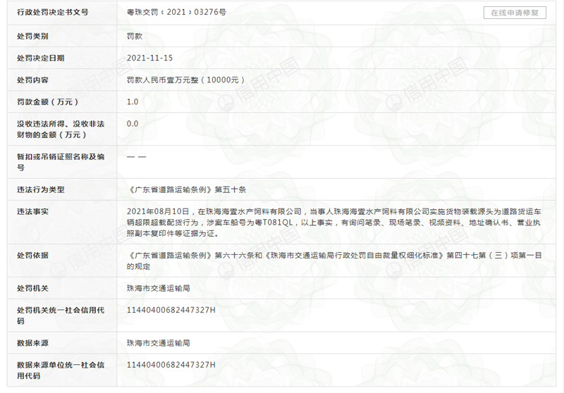 近日,珠海海壹水产饲料有限公司(简称“珠海海壹水产饲料公司”)新增一条行政处罚,处罚原因是为道路货运车辆超限超载配货。行政处罚决定书文号为粤珠交罚﹝2021﹞03276号。