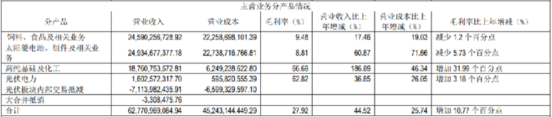 分产品来看,报告期内,公司饲料、食品及相关业务实现营业收入245.90亿元,同比增加17.46%,毛利率为9.48%,同比减少1.2个百分点;太阳能电池、组件及相关业务实现营业收入249.35亿元,同比增加60.87%,毛利率为8.81%,同比减少5.73个百分点;高纯晶硅及化工实现营业收入187.61亿元,同比增加186.89%,毛利率为66.69%,同比增加31.99个百分点;光伏电力实现营业收入16.03亿元,同比增加36.85%,毛利率为62.82%,同比增加3.18个百分点。