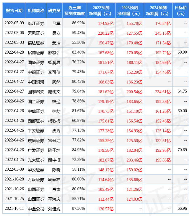 证券之星数据中心根据近三年发布的研报数据计算,中金公司刘佳妮研究员团队对该股研究较为深入,近三年预测准确度均值高达87.36%,其预测2022年度归属净利润为盈利120.57亿,根据现价换算的预测PE为15.71。