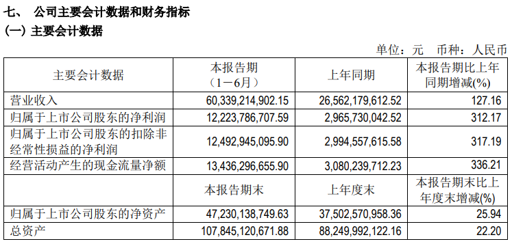 今日(8月17日)晚间,光伏龙头通威股份(SH600438,股价54.8元,市值2467亿元)披露半年报,2022年上半年,公司实现营业收入603.39亿元,同比增长127.16%,归母净利润122.24亿元,同比增长312.17%。