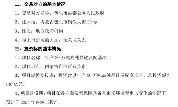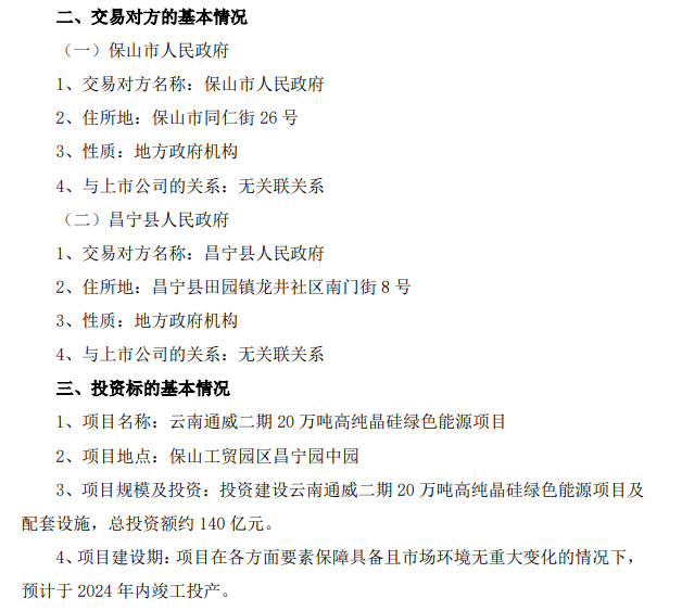 公告显示,通威拟与包头市昆都仑区人民政府、保山市人民政府以及昌宁县人民政府签署协议,约定通威新增投资共280亿元,在两地分别建设年产20万吨高纯晶硅绿色能源项目。