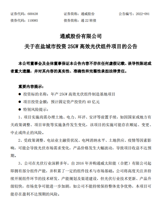 9月22日,通威股份(600438)发布公告称,拟在盐城市投资25GW高效光伏组件项目,预计固定资产投资约40亿元。