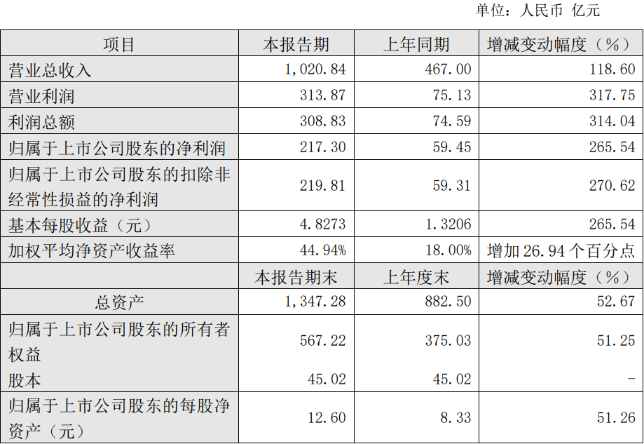 经初步核算,2022年前三季度公司实现营业收入1,020.84亿元,同比增长118.60%;实现归属于上市公司股东的净利润217.30亿元,同比增长265.54%;扣除非经常性损益后归属于上市公司股东的净利润为219.81亿元,同比增长270.62%;基本每股收益4.8273元,同比增长265.54%。