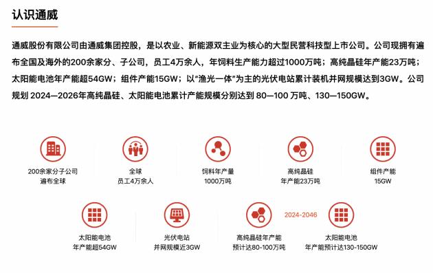 通威股份有限公司由通威集团控股,是以农业、新能源双主业为核心的大型民营科技型上市公司。公司现拥有遍布全国及海外的200余家分、子公司,员工4万余人,年饲料生产能力超过1000万吨,是全球最大的水产饲料生产企业及主要的畜禽饲料生产企业。通威股份市值最高超3000亿元,通威品牌价值突破1600亿元,连续多年荣列“中国企业500强”。