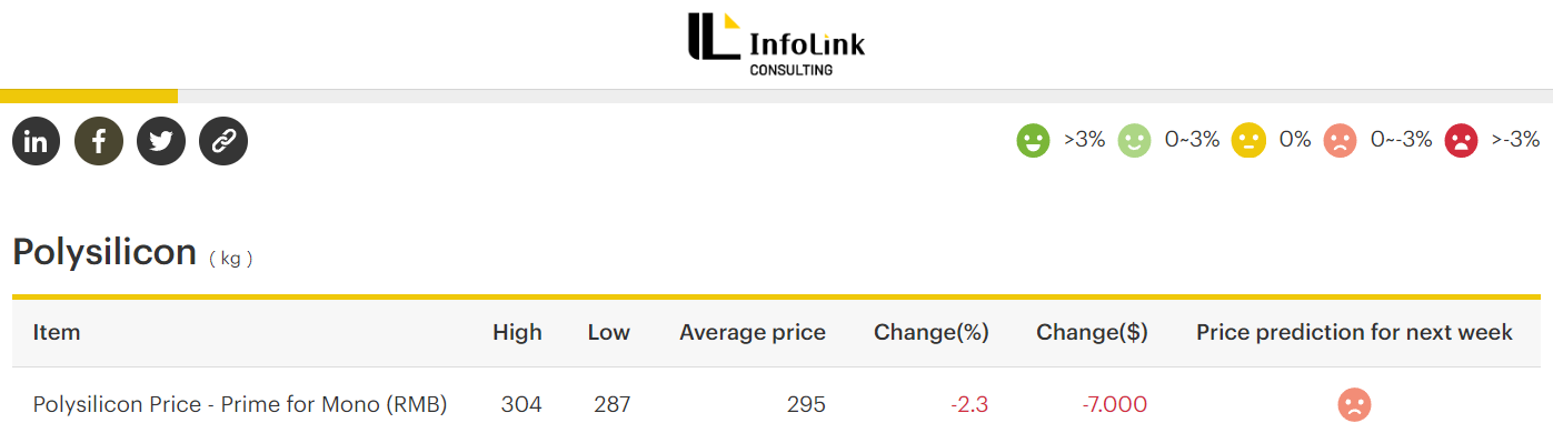 11月23日,PV infolink官网数据显示,多晶硅平均价格为302元/kg,降价1元/kg,最低价突破了300元/kg。