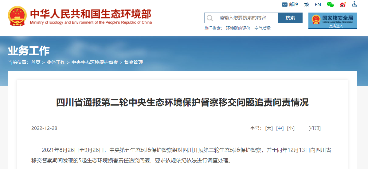 12月28日,生态环境部网站公布了《四川省通报第二轮中央生态环境保护督察移交问题追责问责情况》。2021年8月26日至9月26日,中央第五生态环境保护督察组对四川开展第二轮生态环境保护督察,并于同年12月13日向四川省移交督察期间发现的5起生态环境损害责任追究问题,要求依规依纪依法进行调查处理。