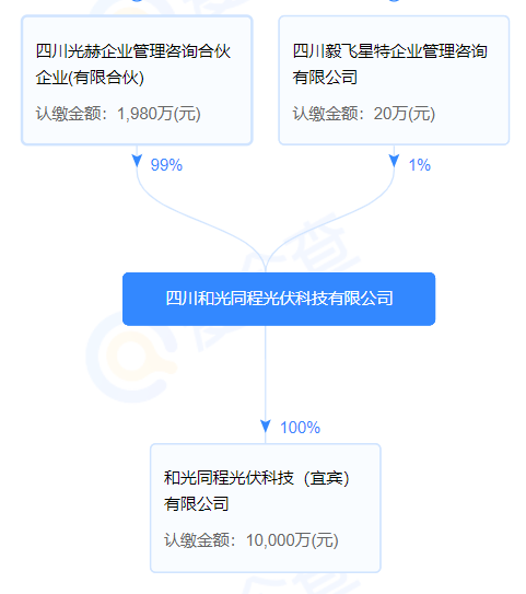 股权结构方面,四川光赫企业管理咨询合伙企业(有限合伙)、四川毅飞星特企业管理咨询有限公司分别持有和光同程99%、1%的股份。公司法定代表人、监事分别为敖志国和李松强。值得注意的是,通威股份光伏商务部副总经理、通威太阳能(盐城)有限公司工程部部长的名字也分别叫做敖志国、李松强。