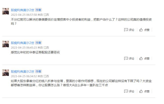 有网友进一步分析称,如果大股东拿着分红的钱八折参与定增,里面的小散作何感想,现在的公司都这样没有下限了吗?大资金都想着怎样割韭菜,你让股票怎么涨?