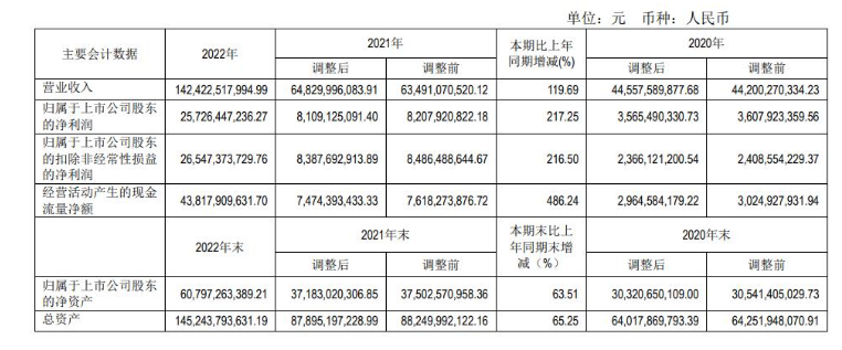 4月24日晚间,通威股份披露2022年年报和2023年一季报。2022年,公司实现营业收入1424.23亿元,年度营收首次突破千亿元大关,同比增幅达到119.69%;归属于上市公司股东的净利润257.26亿元,同比增长217.25%。公司2022年营收、归母净利润双双创下新高。