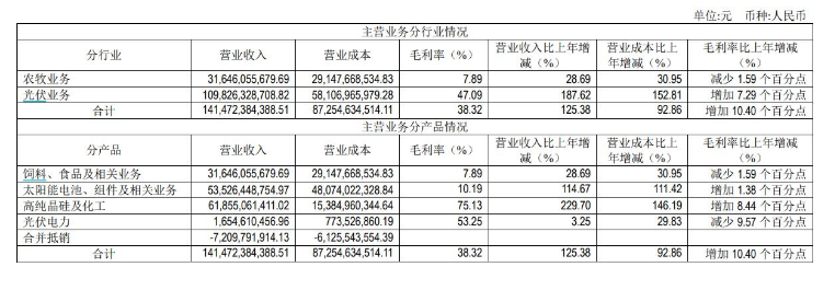 从产品来看,高纯晶硅及化工产品营收增幅最大,达229.70%,实现618.85亿元。