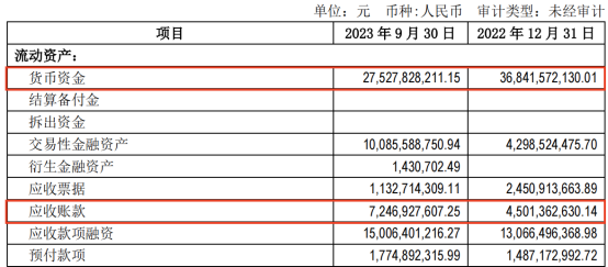 事实上,多个项目投建,通威股份三季度硅料、组件在建工程金额同比增长328.81%。此外,由于组件业务扩大和光伏电站应收补贴增加,截至三季度,公司应收账款72.47亿元,较2022年末提高了61.01%,同期货币资金较去年底下降25.28%。
