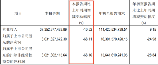 不过,三季度通威股份净利润也出现了下滑。10月25日,通威股份披露三季报,三季度营收373.52亿元,同比下降10.52%,净利润30.31亿元,同比下降68.11%。
