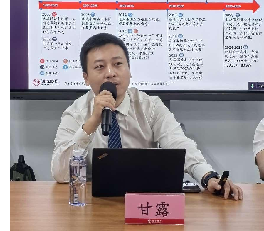 甘露副部长分享了通威股份公司发展情况,结合通威42年发展历程,介绍了通威在绿色农业和绿色能源两个行业取得的成果,围绕行业展望、公司经营情况、未来发展战略、核心竞争优势等方面做了详细介绍,让各投资人对行业、对通威有了更加全面与清晰的认识。