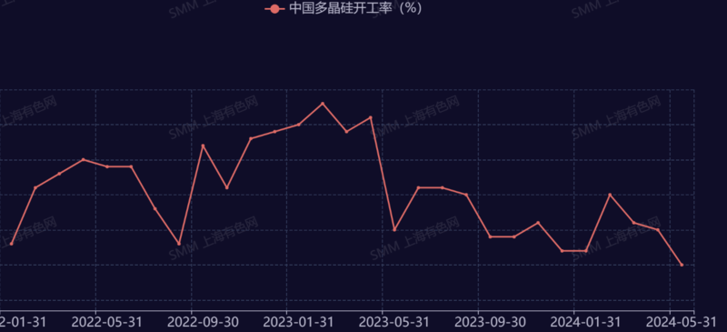 据SMM数据显示,自今年2月份以来,中国多晶硅企业开工率便开始呈现明显的下滑态势,截至5月31日,中国多晶硅企业开工率已经降至65%,相较2月份的高点75%下降10个百分点。