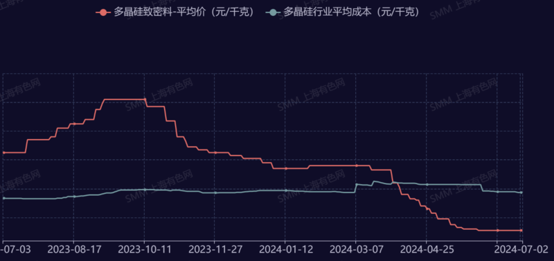 着眼当前的多晶硅市场,据SMM现货报价显示,截至7月2日,多晶硅致密料现货报价暂时维持在34~37元/千克,均价报35.5元/千克,早已跌破多晶硅行业平均成本。而自二季度中后期以来,多晶硅价格历经跌破—行业全成本线、行业现金成本线直至今日已经跌破头部企业现金成本线。这也意味着多晶硅已然进入到全行业亏损境地……