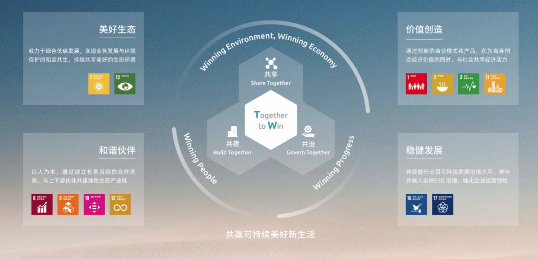 通威积极响应全球可持续发展倡议,致力于将联合国可持续发展目标充分融入公司ESG战略。通威以“Together to Win(共赢)”为使命,提出了“build together(共建)”“govern together(共治)”“ share together(共享)”的核心理念,持续与利益相关方开展深入沟通,进一步明确了和谐伙伴、稳健发展、美好生态、价值创造四大ESG战略方向。