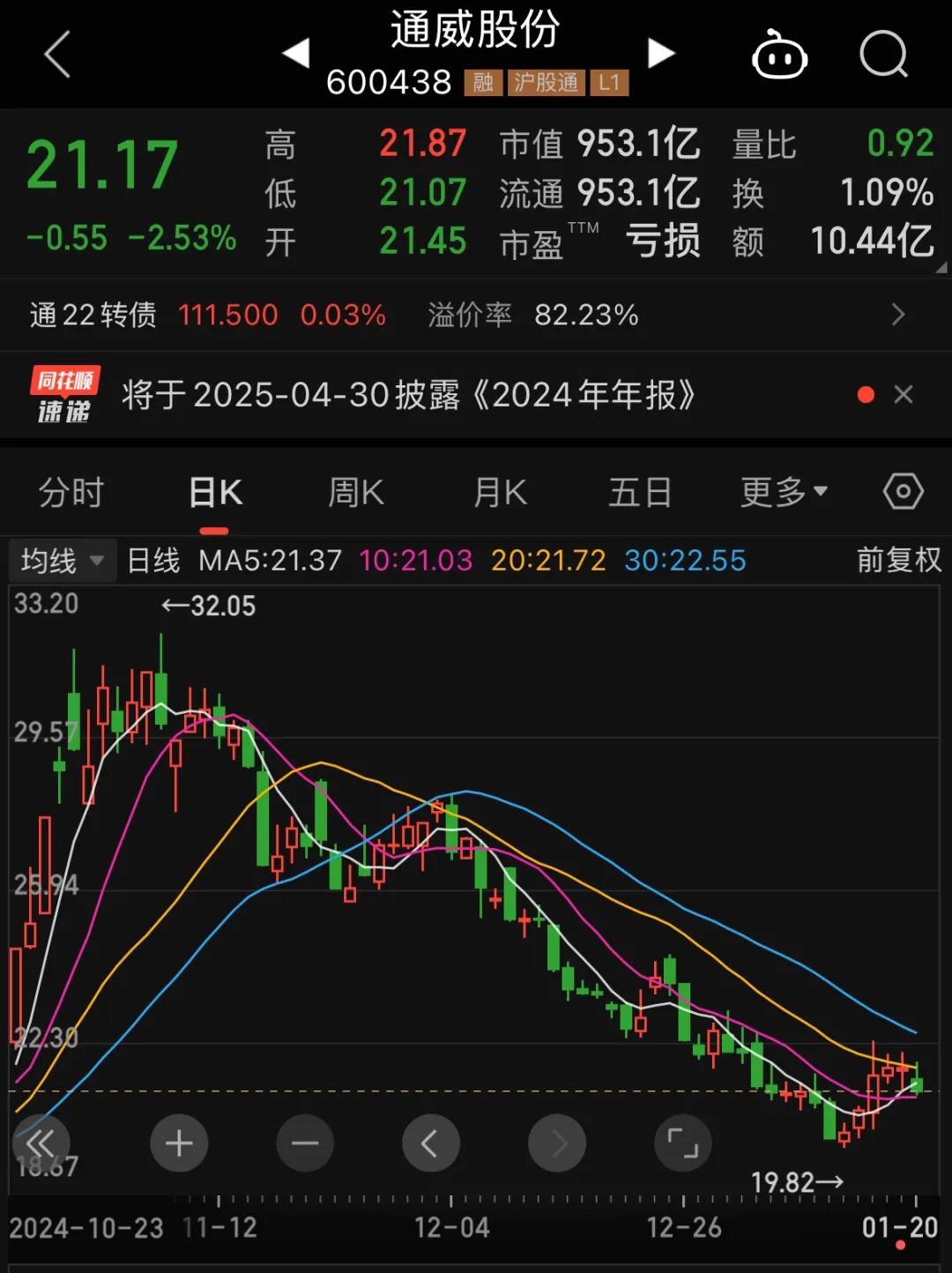 1月20日,通威股份收报21.17元/股,跌幅2.53%,最新市值为953.07亿元。