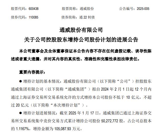 截至1月17日,通威集团已通过上海证券交易所交易系统集中竞价交易方式累计增持公司股份5027.28万股,占公司总股本的 1.1167%,增持金额为10.508793亿元。