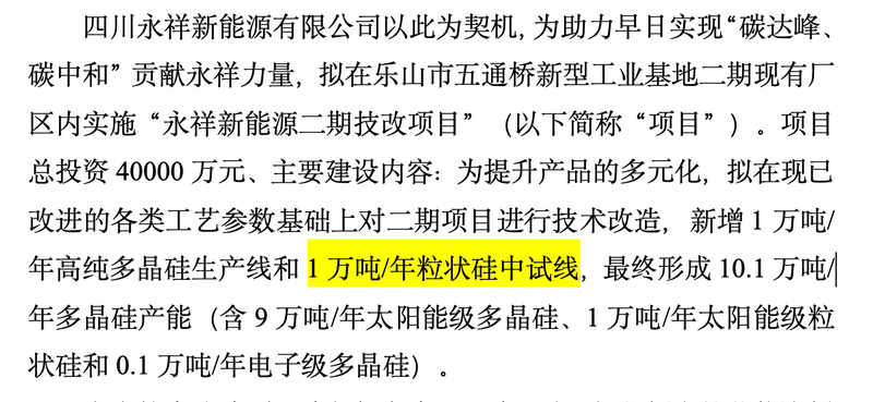 通威股份1月下旬通过官网发布的四川永祥新能源有限公司永祥新能源二期技改项目环境影响报告书征求意见稿公示相关文件显示,该项目总投资4亿元,主要建设内容为对二期项目进行技术改造,新增1万吨/年高纯多晶硅生产线和1万吨/年粒状硅中试线,最终形成10.1万吨/年多晶硅产能(含9万吨/年太阳能级多晶硅、1万吨/年太阳能级粒状硅和0.1万吨/年电子级多晶硅)。