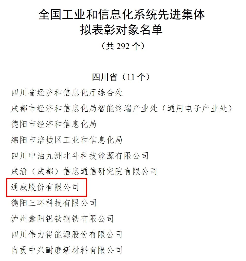 此次入选“全国工业和信息化系统先进集体”,是对通威股份长期以来坚持创新驱动、推动工业和信息化高质量发展的充分肯定。未来,通威股份将以此为契机,继续秉承“追求卓越,奉献社会”的企业宗旨,认真落实党中央、国务院关于推动工业和信息化高质量发展的决策部署,坚持创新驱动发展战略,不断提升核心竞争力,为我国工业和信息化高质量发展贡献新的更大力量!