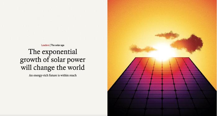 那是一篇极富技术乐观主义精神的分析文章,也是一篇典型的精彩的《经济学人》式的文章,敢于对未来发表不一样的预测,面对美国新能源政策的逆风以及贸易保护主义的不利局面,光伏产业在效率、成本方面的优势将会让人类在触手可及的将来,进入一个energy rich的时代。