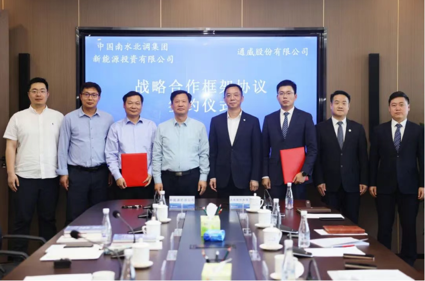 4月24日,通威股份与中国南水北调新能源投资有限公司在北京签署战略合作协议。南水北调新能源公司党委副书记、总经理向云桃,通威股份光伏商务部组件全球营销总经理邱新出席并见签。南水北调中线新能源(北京)有限公司执行董事杨小兵与通威股份光伏商务部组件营销国内集中式负责人沈潇君代表双方签约。