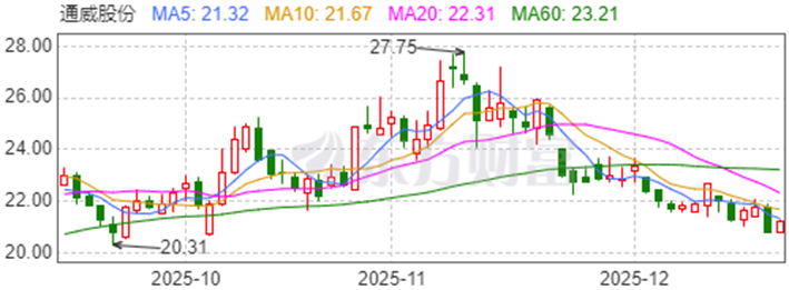 11月11日,通威股份迎来股价调整,26.72 元的收盘价较前一交易日下跌1.62%,主力资金净流出3.38 亿元。次日股价继续下跌 6.06%,收盘价25.10元。11月20日,通威股份股价再遭重挫,单日下跌 5.09%,主力资金当日净卖出1.63 亿元。次日股价大幅低开并跳空击穿多根均线,至收盘时下跌6.59%。从11月10日起算至12月22日,通威股份的股价(收盘价)在32个交易日内,已累计下跌23.27%。