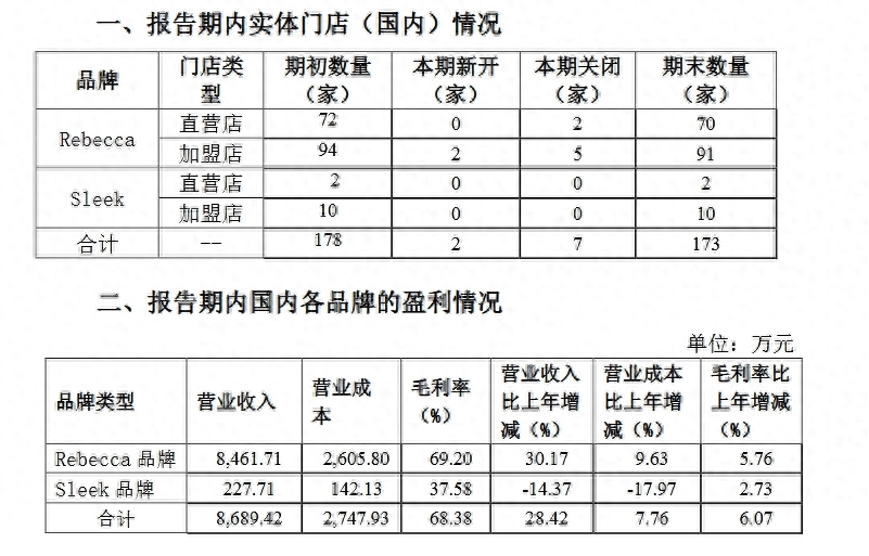 同日,瑞贝卡发布2023年半年度主要经营数据。报告期内Rebecca品牌国内门店关闭7家,新开2家,品牌营业收入为8461.71万元。报告期末,Rebecca品牌和Sleek品牌国内门店共173家,较报告期初减少5家。