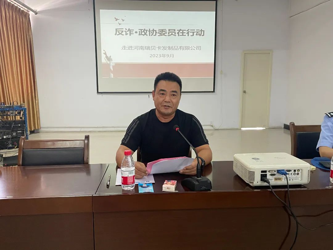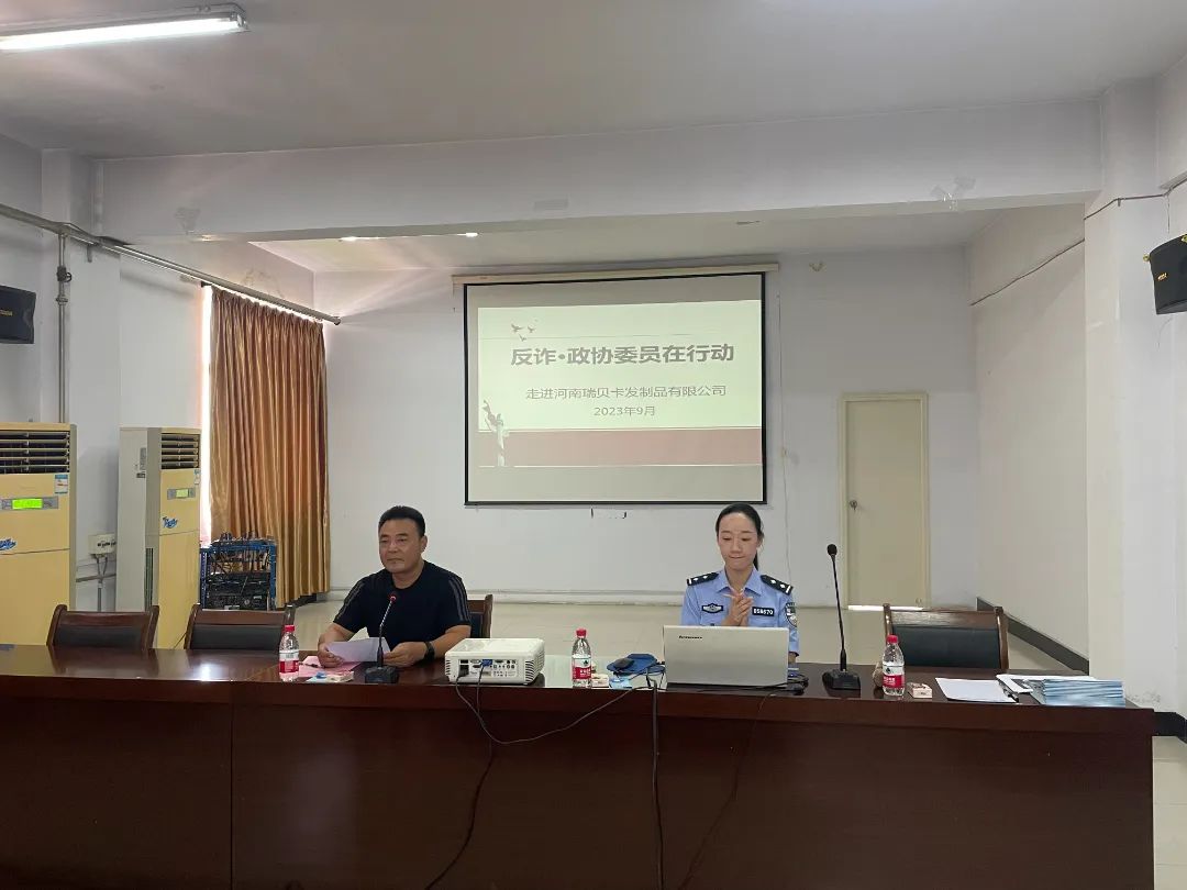 为了更好的提高员工反诈受骗防范意识,营造全民反诈的浓厚氛围,减少财产等经济损失。9月7日,建安区政协联合区公安局反诈中心到瑞贝卡发制品股份公司尚集纤维生产基地,开展“反诈--政协委员在行动”防范电信网络诈骗知识讲座。建安区政协宣法委主任吴双丽,建安区公安局反诈中心队长姚远及公司副总经理郑小生等领导参加讲座。