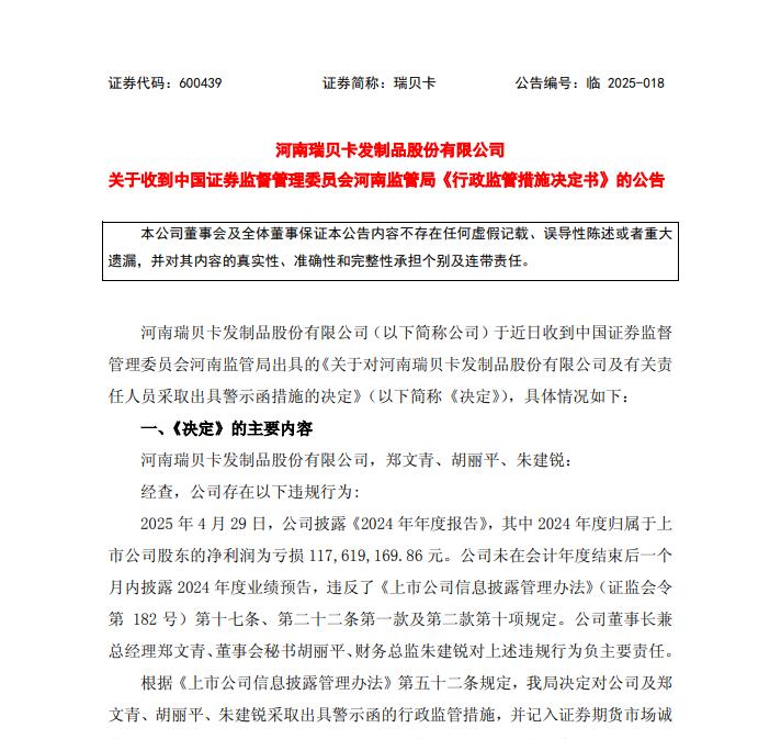 距离上一次整改完成不足两周,河南假发龙头企业瑞贝卡(600439.SH)再度因信披违规被监管点名。6月4日晚间,公司公告称收到河南证监局出具的警示函,直指其未按规定披露2024年度业绩预告。这已是董事长郑文青等高管团队在两个月内第二次被监管警示,而1.18亿元的上市首亏与62%的营销费用增幅,更将这家全球假发巨头的转型阵痛暴露无遗。