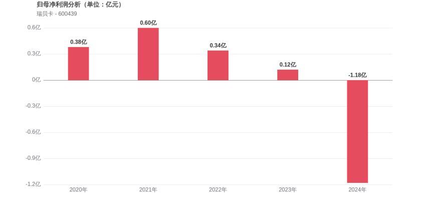 利润角度分析,2020年瑞贝卡实现归母净利润0.38亿元,2024年降至-1.18亿元。公司盈利能力持续承压。