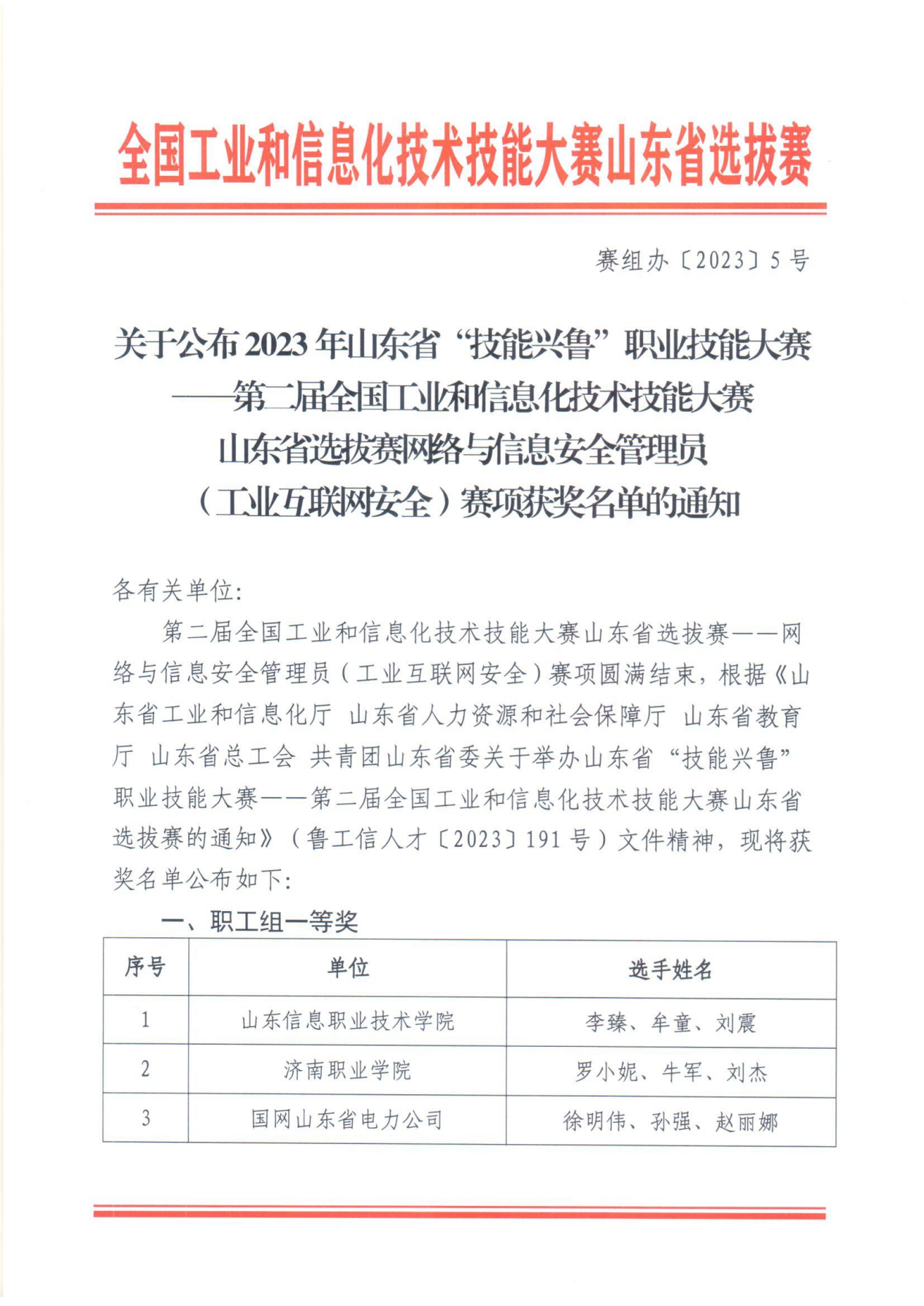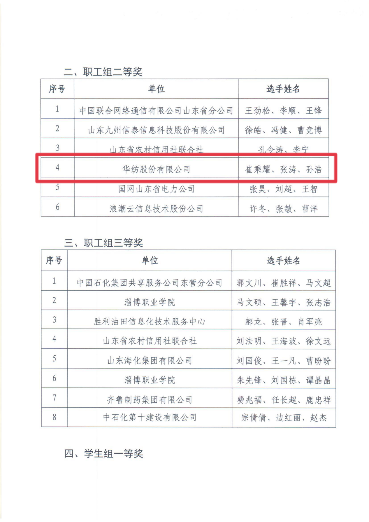 近日,2023年山东省“技能兴鲁”职业技能大赛——第二届全国工业和信息化技术技能大赛山东省选拔赛网络与信息安全管理员(工业互联网安全)赛项圆满结束,华纺股份互联信息部信息中心信息安全管理员崔乘耀、张涛、孙浩三名职工,赛前积极备战,努力研究网络安全前沿技术,赛中通力合作,最终荣获赛项职工组二等奖。