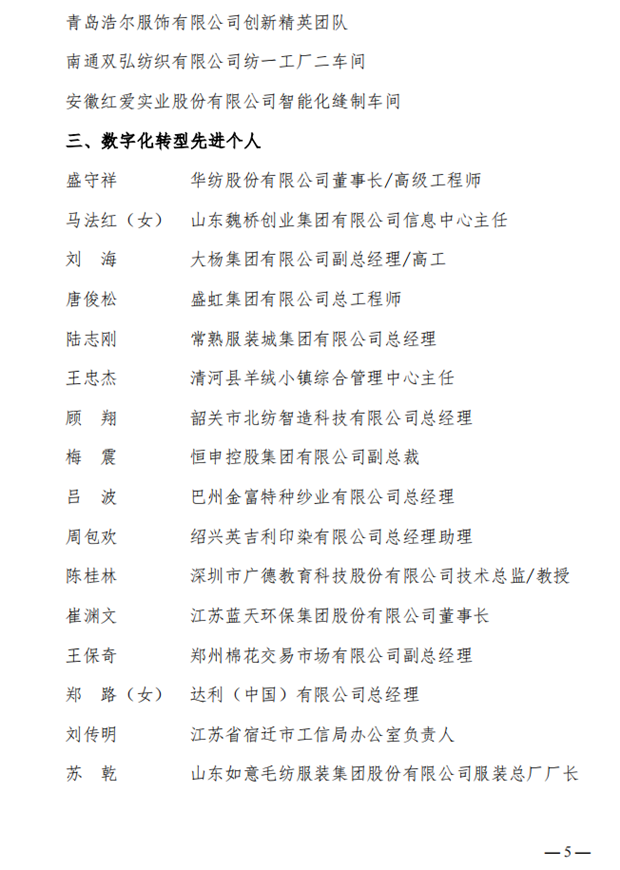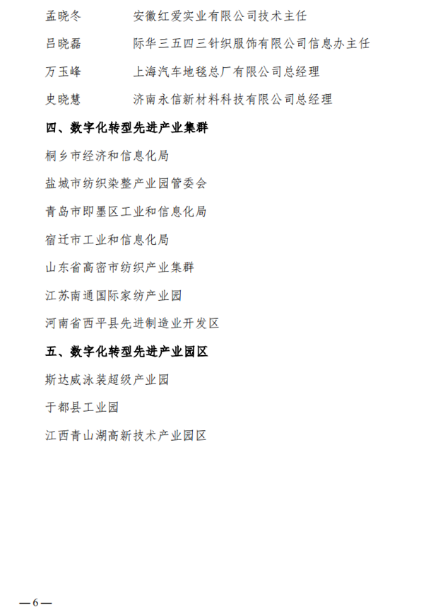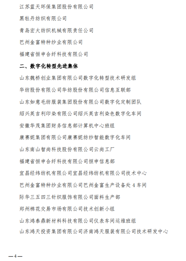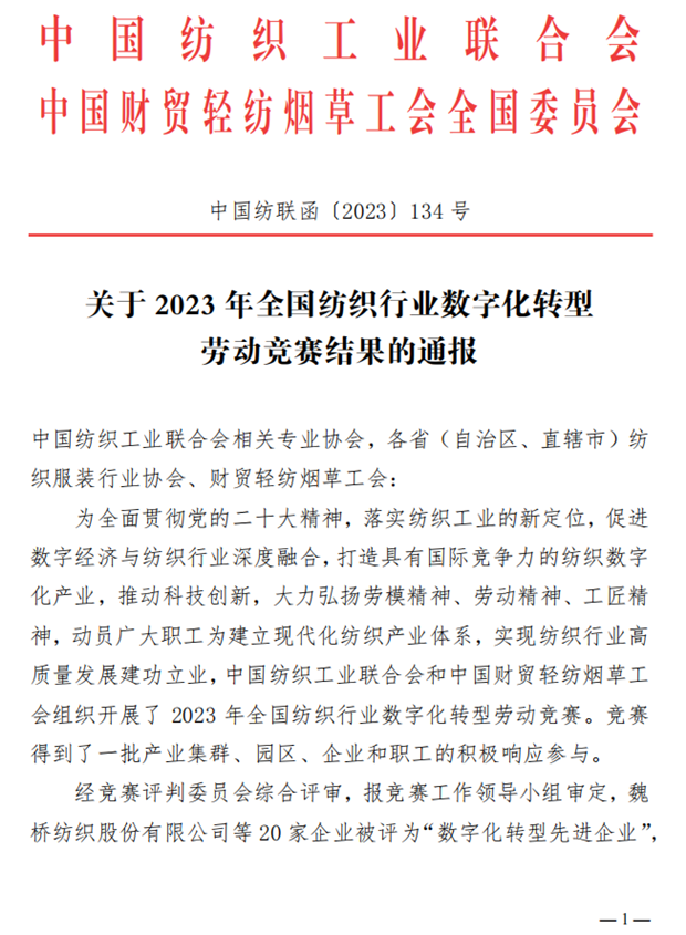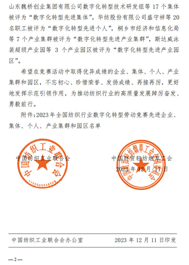 经竞赛评判委员会综合评审,报竞赛工作领导小组审定,魏桥纺织股份有限公司等20家企业被评为“数字化转型先进企业”,山东魏桥创业集团有限公司数字化转型技术研发组等17个集体被评为“数字化转型先进集体”,华纺股份有限公司盛守祥等20名职工被评为“数字化转型先进个人”,桐乡市经济和信息化局等7个产业集群被评为“数字化转型先进产业集群”,斯达威泳装超级产业园等3个产业园区被评为“数字化转型先进产业园区”。