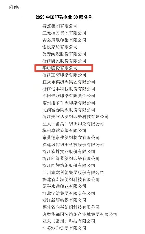 近日,中国印染行业协会下发了《关于公布2023年中国印染企业30强的通知》,通过层层评审,华纺股份蝉联2023年中国印染企业30强名单,这是华纺股份在行业内的实力及业绩得到了再一次的认可。