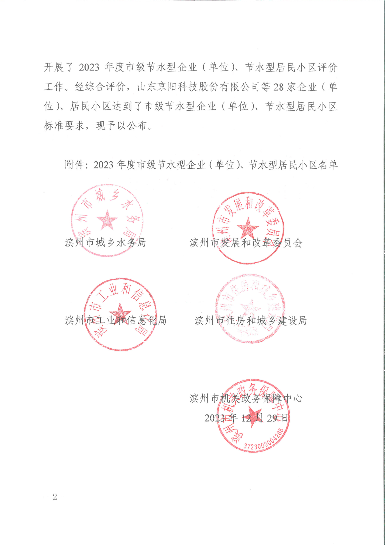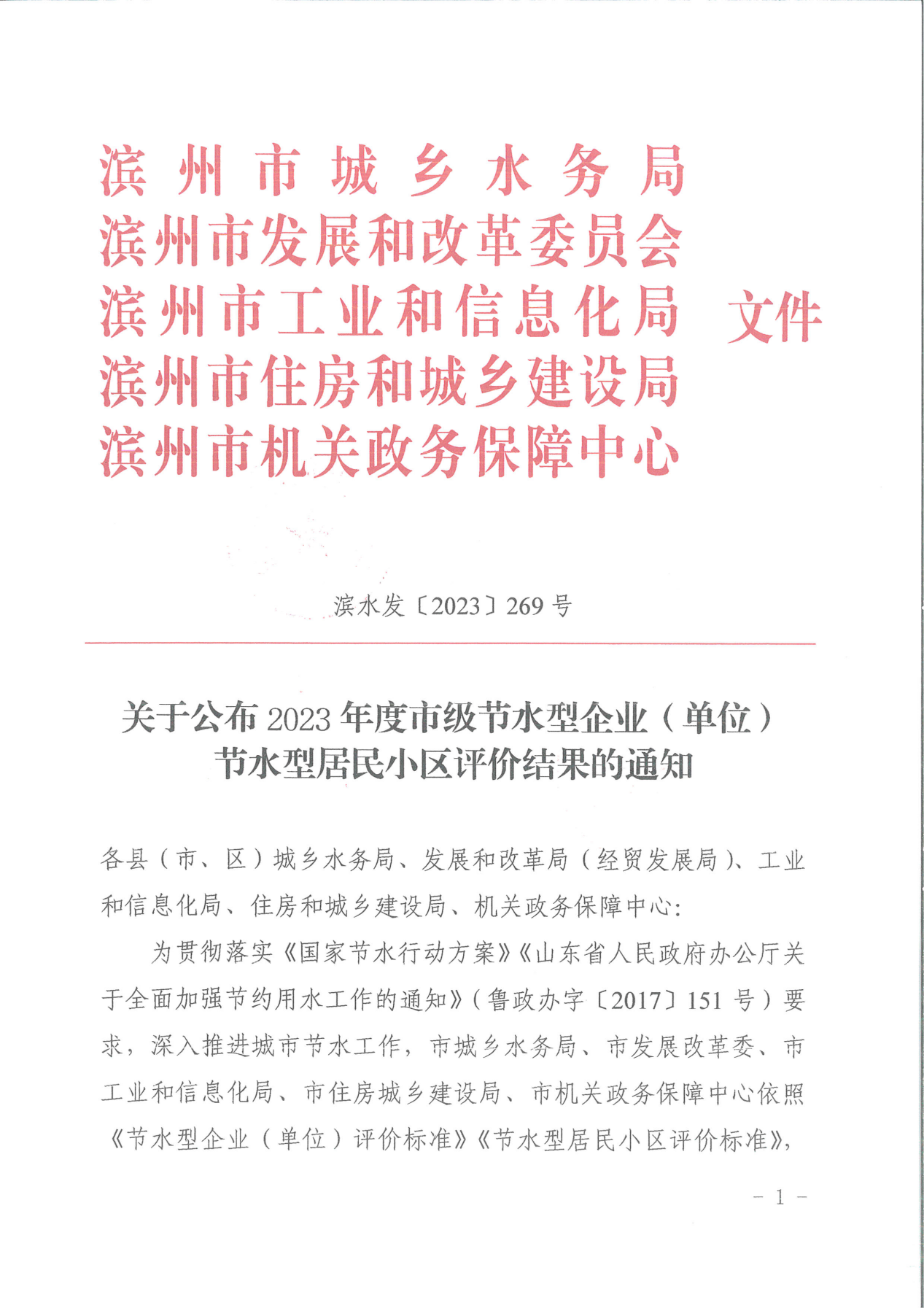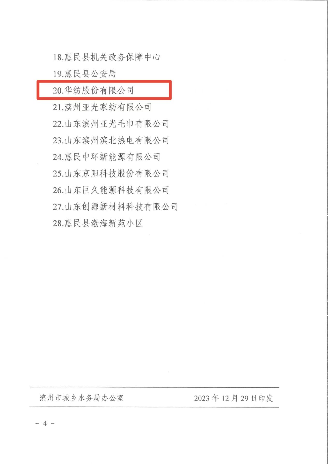 近日,滨州市城乡水务局、滨州市发展和改革委员会、滨州市工业和信息化局、滨州市住房和城乡建设局、滨州市机关政务保障中心发布了《关于公布2023年度市级节水型企业(单位)、节水型居民小区评价结果的通知》,经综合评价,华纺股份达到市级节水型企业(单位)、节水型居民小区标准要求,获评2023年度滨州市节水型企业。