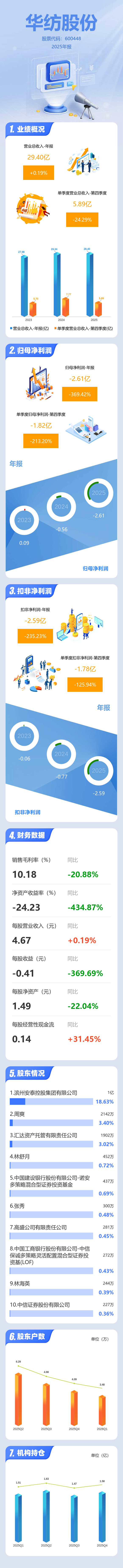 证券之星消息,华纺股份2025年年报显示,当年度公司主营收入29.4亿元,同比上升0.2%;归母净利润-2.61亿元,同比下降369.42%;扣非净利润-2.59亿元,同比下降235.23%;其中2025年第四季度,公司单季度主营收入5.89亿元,同比下降24.29%;单季度归母净利润-1.82亿元,同比下降213.2%;单季度扣非净利润-1.78亿元,同比下降125.94%;负债率73.39%,投资收益0.2万元,财务费用8408.88万元,毛利率10.18%。
