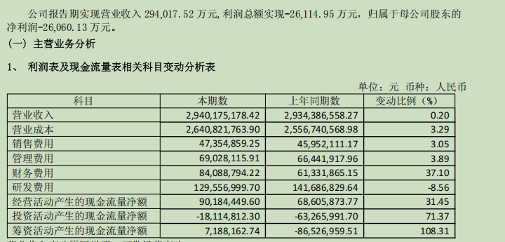 报告显示,公司全年实现营业收入29.40亿元,同比增长0.20%;归属于上市公司股东的净利润为-2.61亿元,较上年-5551.55万元进一步扩大亏损,呈现典型的“营收微增、净利巨亏”特征,在纺织印染行业深度调整期颇具代表性。