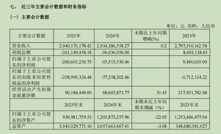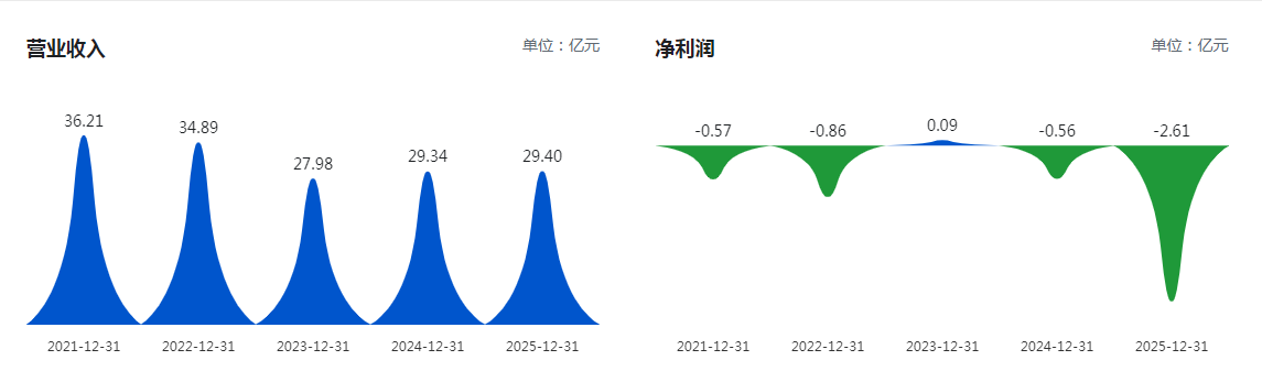 但盈利端未能同步上行且持续亏损,2025年归属于上市公司股东的净利润为-2.61亿元,较上年-5551.55万元进一步扩大亏损,扣除非经常性损益净利润-2.59亿元,基本每股收益-0.4138元,近3年净利润呈现“二连降”。