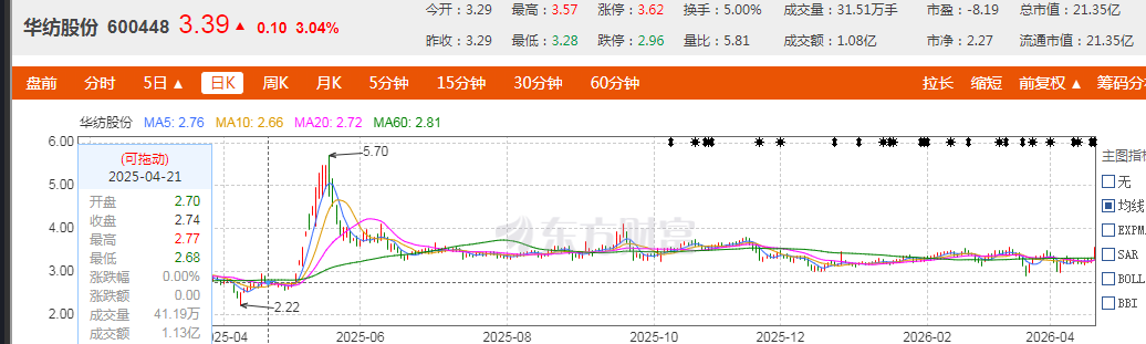 市场表现方面,2025年报披露后次日,华纺股份股价开盘小幅上涨,至上午收盘,报收3.38元/股,上涨2.74%。2025年4月21日至2026年4月20日的一年间,华纺股份股价累计上涨20.07%。