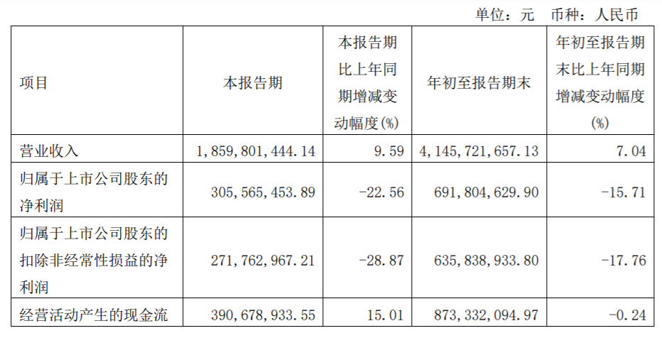 前三季度宁夏建材营业收入41.46亿元,同比增7.04%;归属于上市公司股东的净利润6.92亿元,同比降15.71%。