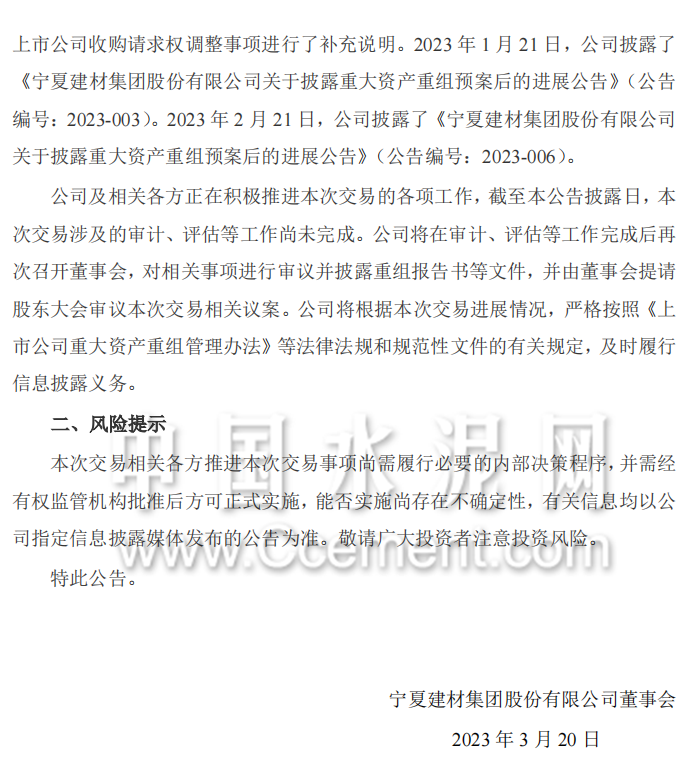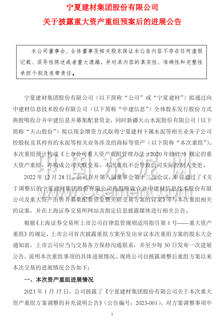 3月20日,宁夏建材发布“关于披露重大资产重组预案后的进展公告”,内容显示,宁夏建材集团股份有限公司拟通过向中建材信息技术股份有限公司全体股东发行股份方式换股吸收合并中建信息并募集配套资金,同时新疆天山水泥股份有限公司拟以现金增资方式取得宁夏建材下属水泥等相关业务子公司控股权及其持有的水泥等相关业务涉及的商标等资产。