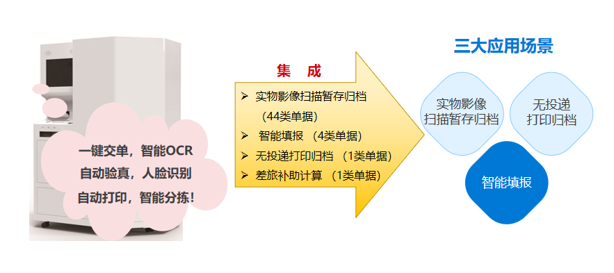 提效:最大程度的释放手工操作的环节,自动化处理大量财务单据,通过云计算技术实现远程操作管理,让财务人员无需再现场操作即可完成工作流程,提高业务处理效率,财务人员对单据分拣整理装订时间节约70%,业务人员扫描、识别查验时间节约50%。