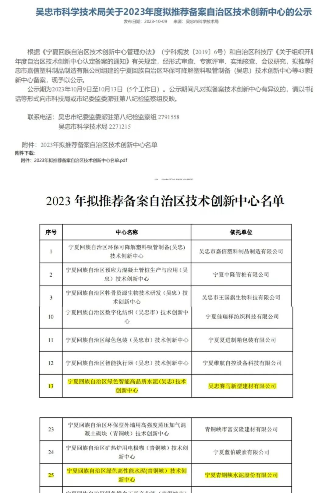 近日,根据《宁夏回族自治区技术创新中心管理办法》(宁科规发﹝2019﹞6号)和自治区科技厅《关于组织开展2023年度自治区技术创新中心认定备案的通知》有关规定,经形式审查、专家评审、实地核查、会议研究。吴忠赛马新型建材有限公司宁夏回族自治区绿色智能高品质水泥(吴忠)技术创新中心和宁夏青铜峡水泥股份有限公司宁夏回族自治区绿色高性能水泥(青铜峡)技术创新中心榜上有名。